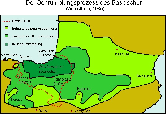 Es ist bekannt, dass sich das Gebiet, in dem Baskisch je gesprochen wurde, kontinuierlich verkleinerte. Dieser Schrumpfungsprozess dürfte sehr früh begonnen haben. Wir können also davon ausgehen, dass Baskisch in früheren Zeiten in einem sehr viel größeren Gebiet verbreitet war, etwa in der gesamten Region, in der die Alteuropäischen Ortsnamen zu finden sind - Sie erinnern sich an die Karte.