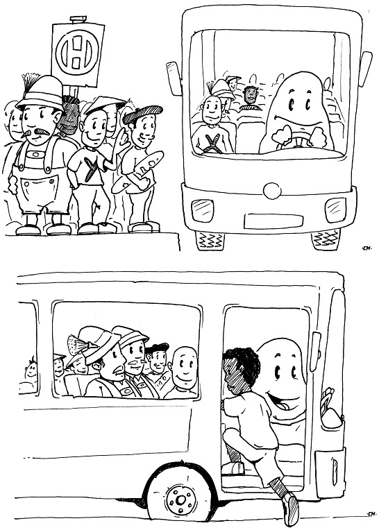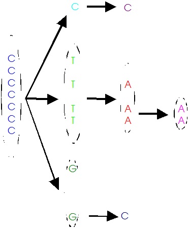 Mit diesem Comic möchte ich Ihnen den Unterschied von rekombinierender und nicht rekombinierender DNS verdeutlichen. Die "Personen" sind die Chromosomen und tauschen "Körper"-teile aus bei jeder Generation. Der "Busfahrer" stellt die Mitochondrie dar. Sie bleibt immer gleich.