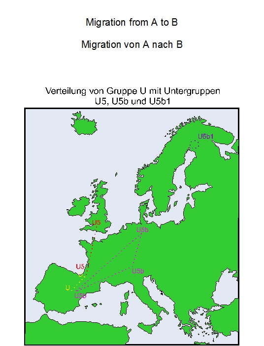 U5b1 geht aus U5b hervor und ist nur im fernen Norden vorhanden. Das weist ganz eindeutig auf die Migration von A nach B hin. In unserem Fall war es das Ausschwärmen vom eiszeitlichen Rückzugsgebiet aus nach Mittel- und Nordeuropa.