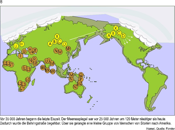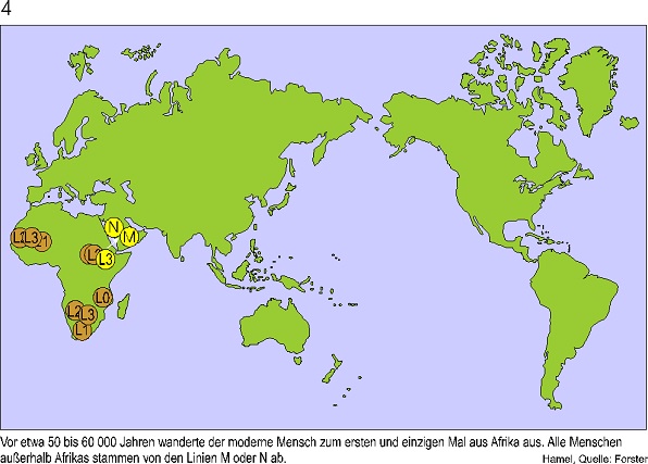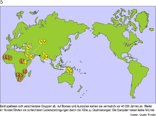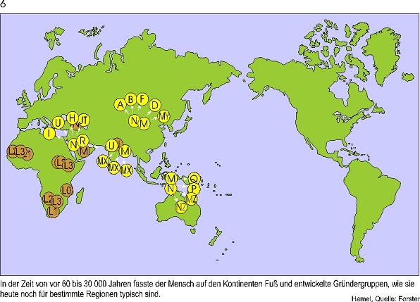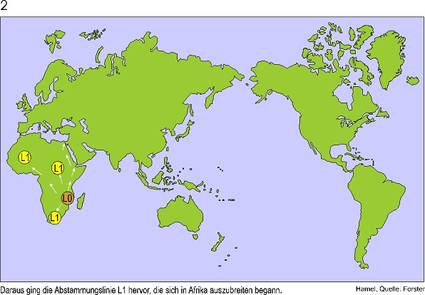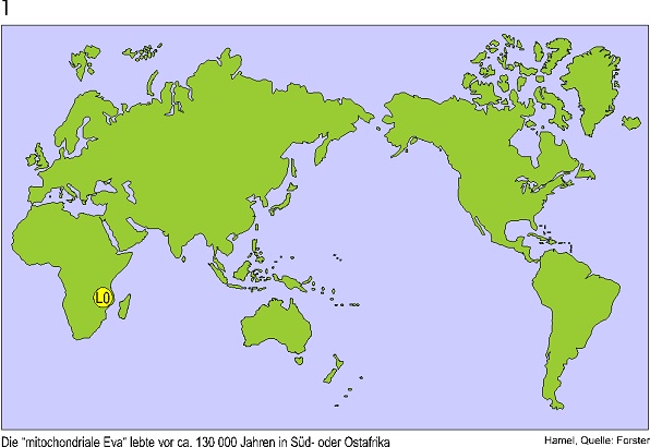 Ich zeige hier die Ergebnisse eines Genetiker Teams um Peter Forster in Cambridge. Er hat eine neue Methode zur Rekonstruktion genetischer Stammbäume entwickelt, die nur aus nichtrekombinierender DNS rekonstruiert werden können. Diese DNS finden wir in den Mitochondrien.