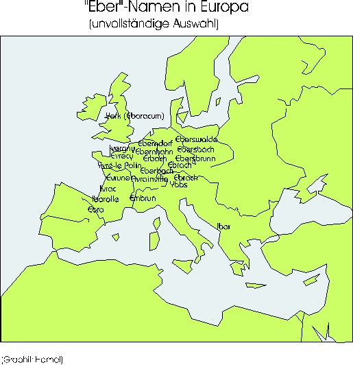 Das sind heute Ortsnamen, die alle auf die Wurzel ibar zurückgehen; der Fluss Ebro in Spanien ist auf diese Weise mit der Ebrach in Ebersberg verwandt.