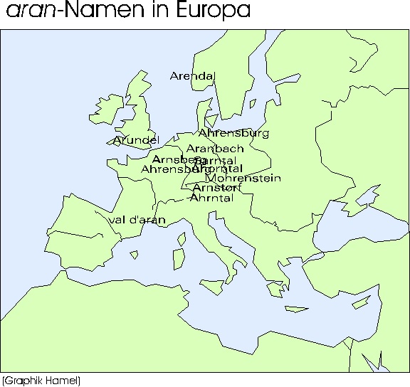 Dasselbe gilt für Ortsnamen, die auf die Wurzel ara, aran zurückgehen. Ara oder aran bedeutet im heutigen Baskisch 'Tal'. Und wie sollte es anders sein, alle Ortsnamen, die diese Wurzel haben, benennen ein Tal.