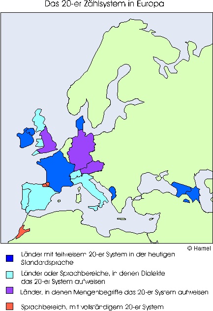 Die blau gefärbten Regionen auf der Karte zeigen an, wo das Zwanziger-Zählsystem teilweise benutzt wird, wie im Französischen, da ist es nicht durchgehend. Während die rote Einfärbung die 100 %-ige Nutzung des Zwanzigersystems darstellt. Das sind: Tahelhit, eine Berber Sprache, und das Baskische.