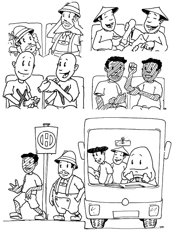 Mit diesem Comic möchte ich Ihnen den Unterschied von rekombinierender und nicht rekombinierender DNS verdeutlichen. Die "Personen" sind die Chromosomen und tauschen "Körper"-teile aus bei jeder Generation. Der "Busfahrer" stellt die Mitochondrie dar. Sie bleibt immer gleich.