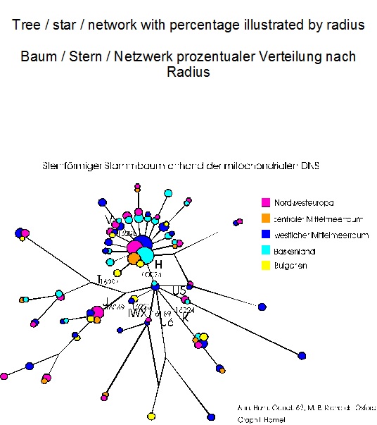 Das ist derselbe Baum mit anderer Gewichtung. Die Wurzel ist auf der Nucleotidposition 00073. Die Fläche jedes dieser Kreise verhält sich direkt proportional zur Zahl der getesteten Personen. Klein bedeutet wenig, größer heißt mehr Individuen. Die Farben beziehen sich auf dieser Graphik auf die Regionen, wo diese Proben genommen wurden. Auf den ersten Blick fällt uns diee sternförmige Anordnung auf, die den Gründereffekt nach der Eiszeit zeigt. Diese Netze entstehen durch Rück-Mutationen, die natürlich den perfekten Baum stören.