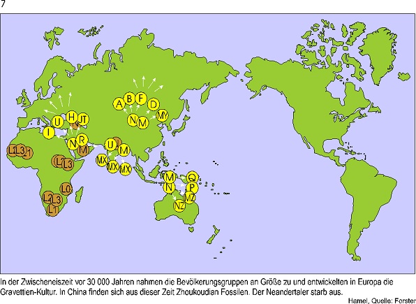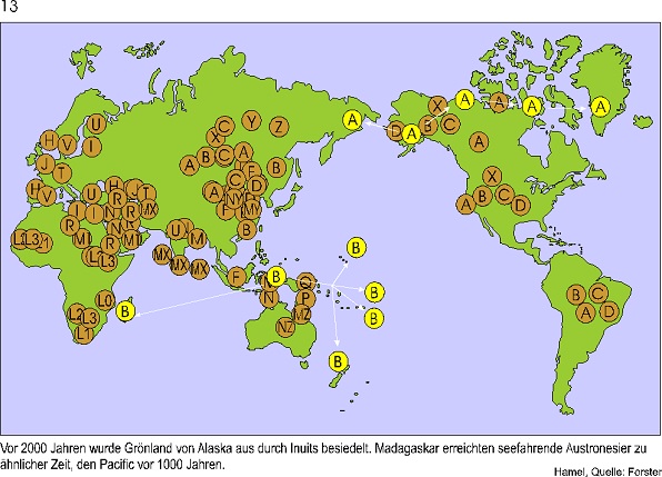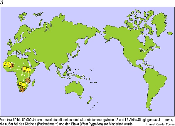 Ich zeige hier die Ergebnisse eines Genetiker Teams um Peter Forster in Cambridge. Er hat eine neue Methode zur Rekonstruktion genetischer Stammbäume entwickelt, die nur aus nichtrekombinierender DNS rekonstruiert werden können. Diese DNS finden wir in den Mitochondrien.