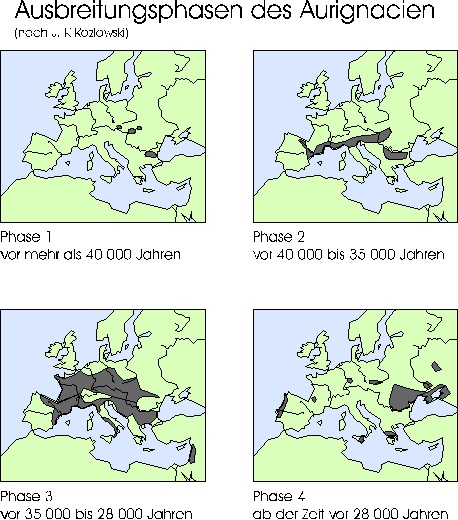 Die Aurignacien Kultur kam vom Osten her nach Europa. Das sind die verschiedenen Ausbreitungsphasen per Carbon-Datierung.