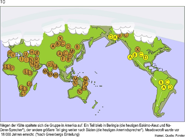 Und hier zeige ich die Wanderung von A nach B anhand einer speziellen Linie. Es ist ein glücklicher Zufall, das diese Linie so klare Ergebnisse liefert. Und diese Mutationen beweisen die Auswanderung aus dem Eiszeitrefugium.
