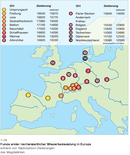 Denn das Magdalénien entstand in diesem eiszeitlichen Rückzugsgebiet. - Als sich die Erde vor etwa 10 000 Jahren dann wieder erwärmte, konnten die Menschen von diesem Rückzugsgebiet aus Europa weiträumig und das ganze Jahr über besiedeln und trugen diese Kultur mit sich. Die Funde kann man über die Carbon-Datierung einordnen. Ich habe für Sie die verschiedenen Phasen auf der Karte dargestellt.