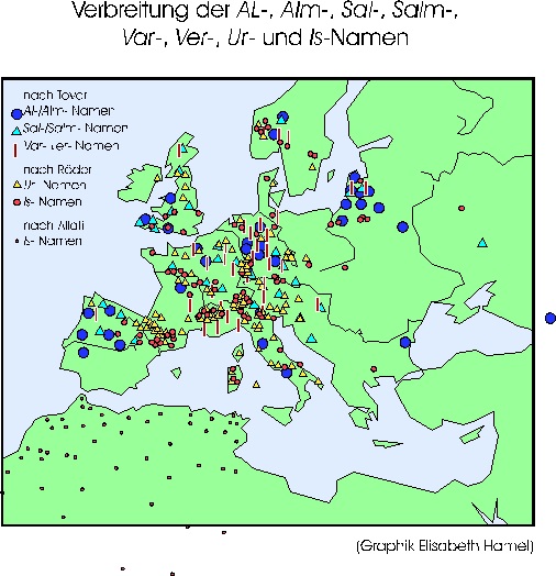 Vennemann rekonstruierte das baskische Etymon: +is- für ‘Wasser’ auf der vorigen Karte die roten Punkte. Dabei sucht man nach den ältesten bekannten schriftlichen Urkunden dieser Namen und rekonstruiert nach aller Kunst der Sprachwissenschaft die Wurzel und die ist +is. Isar, Eisach, Isère usw.